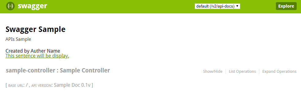 ApiInfo apiInfo = new ApiInfo("Swagger Sample", "APIs Sample", "Sample Doc 0.1v", "", "Author Name", "This sentence will be display.", "/");