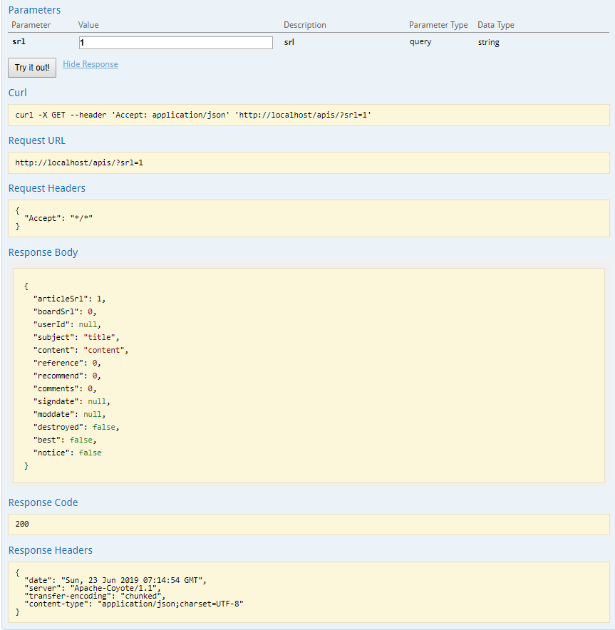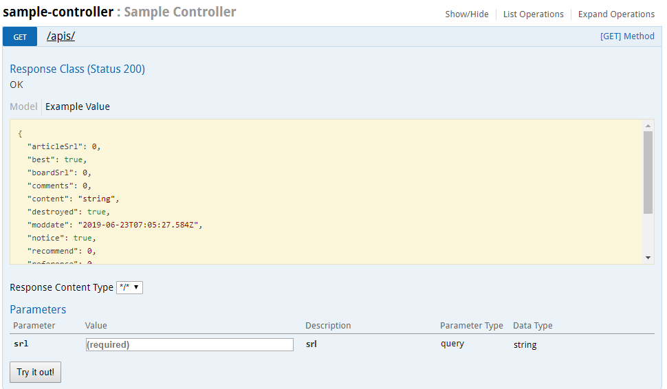 선택한 Method 를 호출하였을 시 받게 되는 결과값이 예시로 나와 있으며, 하단에는 해당 Method 에서 제공하는 Parameter 정보가 파라미터명과 Type 까지 상세히 표시되고 있으며 이를 입력하여 Try it out! 으로 실제로 서비스 호출을 할 수 있다.