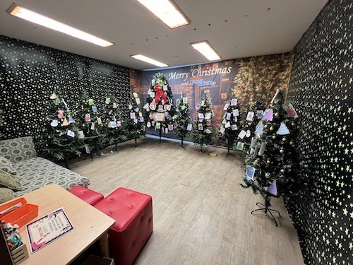 옆방에는 이렇게 크리스마스 트리와 함께 간단한 엽서를 적을 수 있게 꾸며놓았어요.
