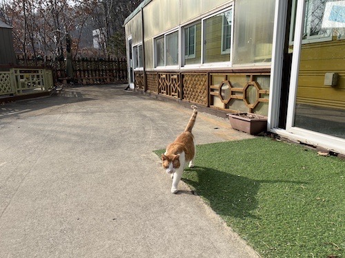 에코관에 가려하면 고양이 한마리다 먼저 마중을 나와줘요.