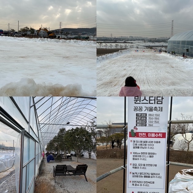 그리고 눈썰매 지역 바로 옆에는 비닐하우스가 있으며 내부에도 많은 테이블이 있습니다.