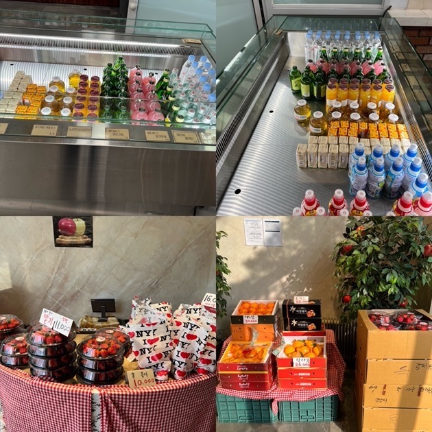 참, 그리고 아이들을 위한 음료는 옆에 따로 준비되어 있어요. 뽀로로주스, 탄산수, 우유, 골드메달 사과주스, 물 등이 있으니 아이들 음료도 걱정 없네요. 아, 또 위에 깜빡했는데, 완전 입구 문 열자마자에는 특산물…. 이 아닌데.. 계절과일이라 그런가… 요거는 그냥 참고만 하시면 되지 않을까 싶습니다.