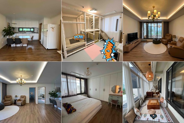 - 다른 방에는 아이를 위한 공간이 있어요. 정글짐이 잇고, 주방놀이 기구 및 완전 유아를 위한 장난감도 있어요.