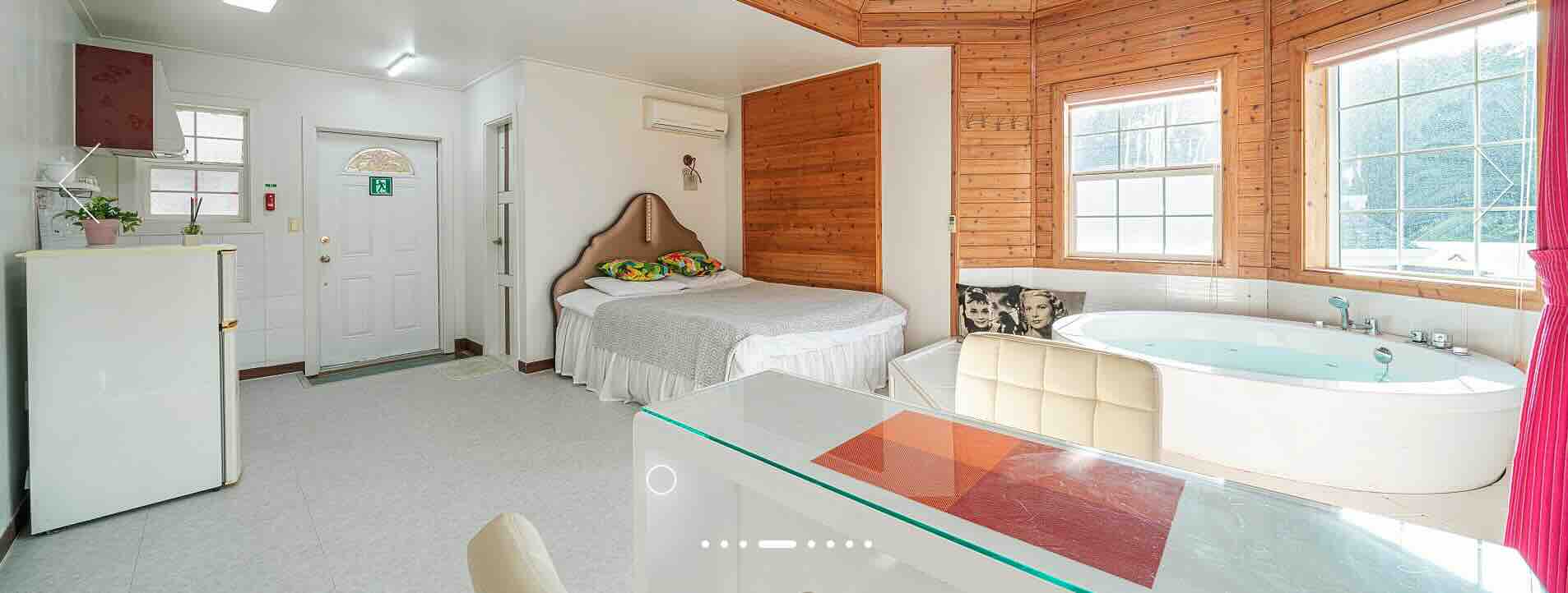이건 저희가 묵었던 201호실 사진이에요. (찍은 사진을 모르고 지워서 홈페이지 사진을 가져왔는데.. 실제랑 같습니다!) 이 방의 포인트는 역시 창가에 있는 저 동그란 스파 욕조!! 따뜻한 물에 몸 담그고 누워있으면 진짜 하루의 피곤이 싹 가시더라구요.. 하지만.. 역시 어른 보다는 아이들의 물놀이 장이 되는 건 어쩔 수 없... 6세, 3세 아이둘이 들어가서 놀아도 될 정도로 상당히 커서 아이 둘이서 이틀 내내 물 받아놓고 놀았네요~