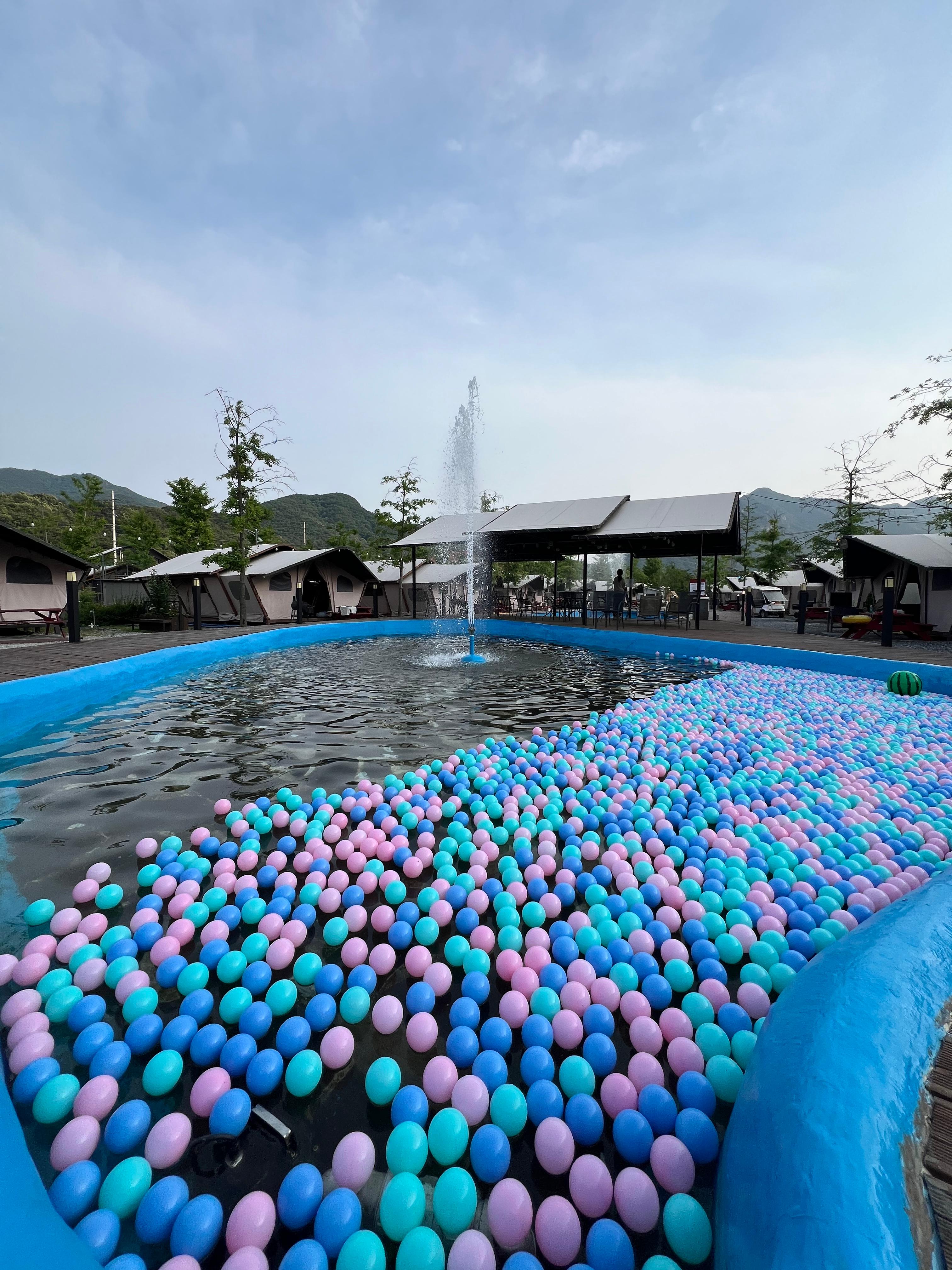 글램핑장 한쪽으로는 이렇게 맑고 얕은 물이 흐르는 계곡이 길게 이어져 있었어요. '밸리 존'이라고 불리던데, 물이 깊지 않고 깨끗해서 아이들이 안전하게 발 담그고 물장구치며 놀기에 완전 최고였어요. 파라솔 아래 평상에 앉아 쉬기 딱이더라구요. 그리고 사진에는 찍히지 않았는데 윗쪽으로는 작은 오리장난감도 있고, 또 12~15kg 아이 둘이 탈 수 있는 작은 물놀이 보트튜브도 있었어요~ 역시나 아이들이 정말 좋아했지요 ㅎㅎ 그리고 얕아서 위험하지도 않구요~