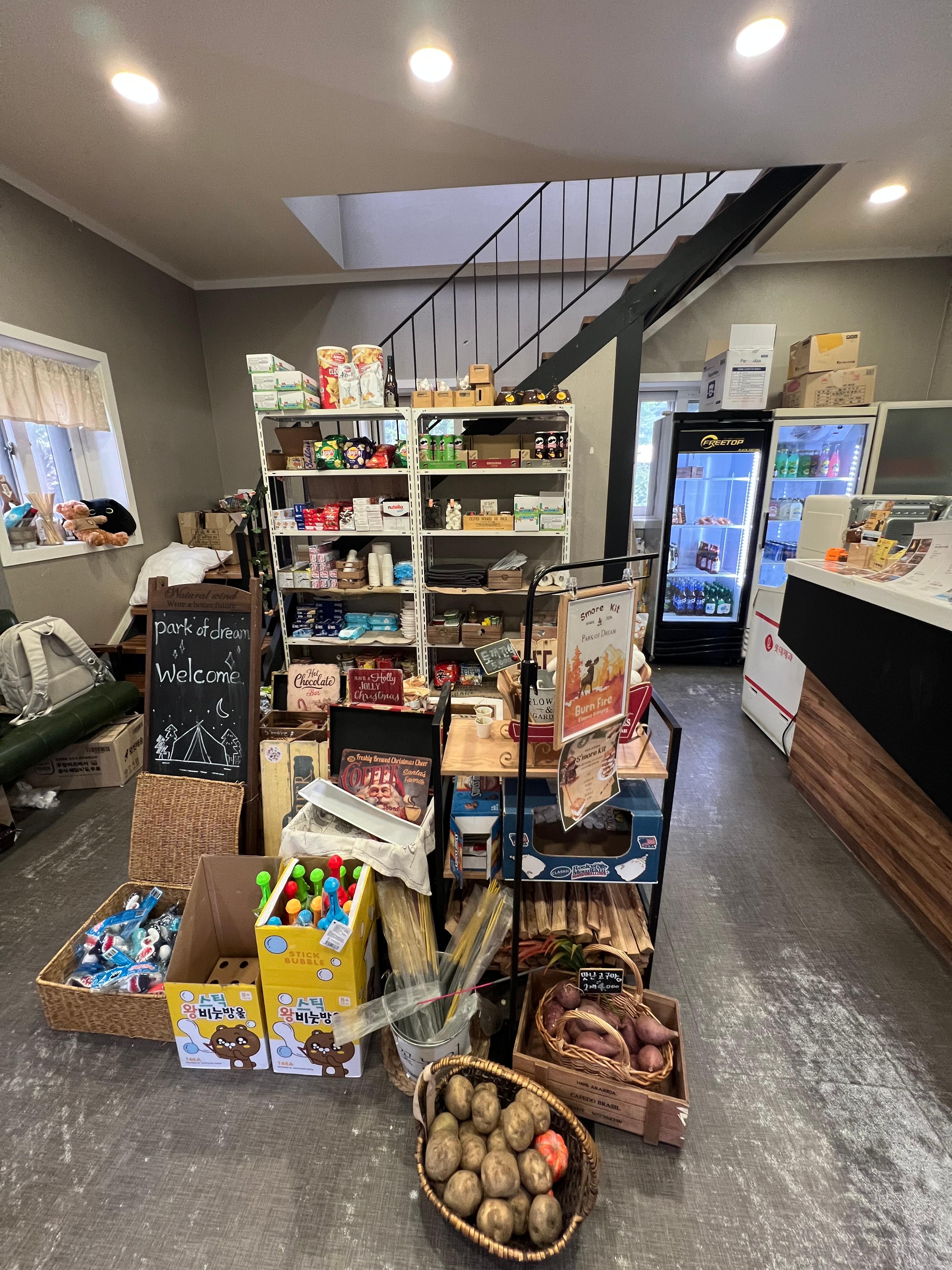 관리동 1층에는 체크인 카운터와 함께 매점이 운영되고 있었어요. 과자, 음료, 주류는 물론이고 아이스크림, 폭죽, 비눗방울, 심지어 급하게 필요한 양념이나 햇반까지 웬만한 건 다 있더라구요. 깜빡하고 빠뜨리고 온 게 있어도 이곳에서 수급이 가능해 보였어요. (사실 맥주만 있으면 됩니다......................ㅎㅎㅎㅎㅎㅎㅎ)