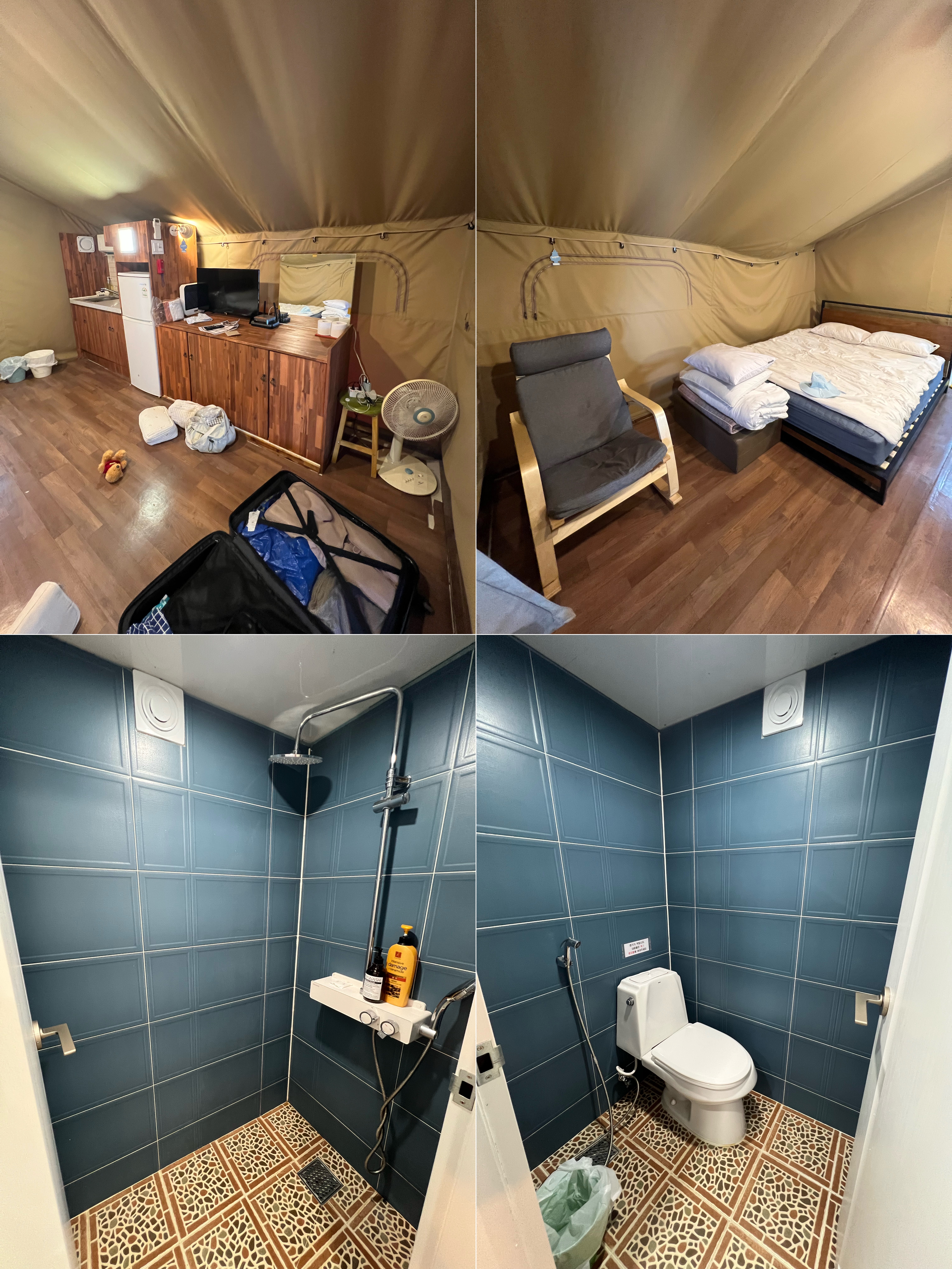 그리고 세번째 사진은 텐트 내부의 사진! TV, 에어컨, 냉장고, 싱크대가 있는 주방 공간은 물론이고, 푹신한 침대와 여분 침구까지 완벽하게 갖춰져 있었어요. 가장 감동이었던 건 텐트 안에 있는 개별 샤워실과 화장실! 정말 깔끔하고 수압도 좋아서 불편함이 하나도 없었답니다. 이게 바로 글램핑의 매력이죠!
