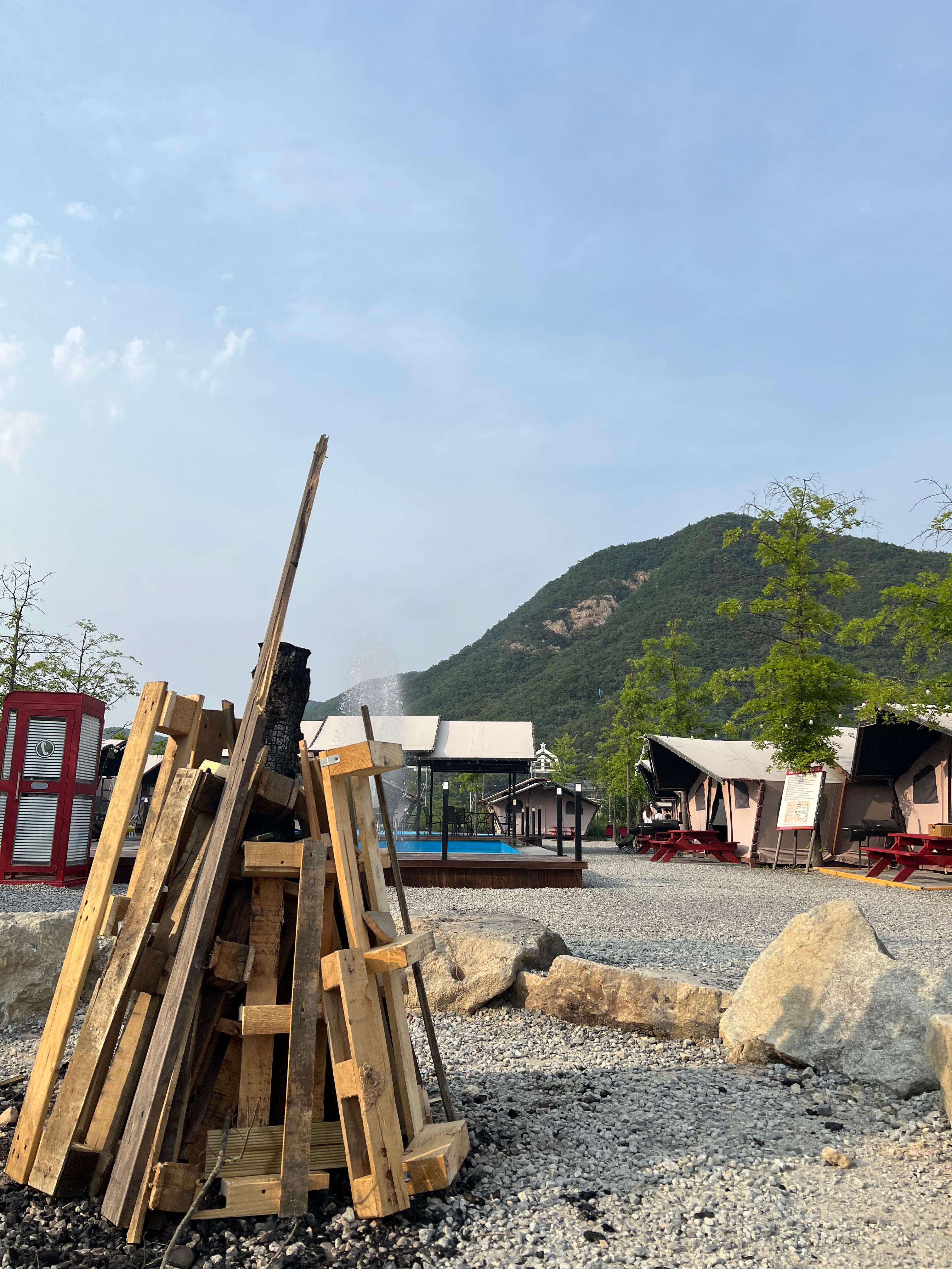 저희가 묵었던 '파크동' 구역이에요. 텐트들이 둥글게 모여있고 중앙에 커다란 캠프파이어 장이 있었어요. 저녁이 되면 사진의 장작에 정말 큰 불을 피워주시는데, 불 구경하며 개인 화로가 없으면 잔불에 마시멜로도 구워 먹고 스모어도 만들어 먹을 수 있어 정말 낭만적이더라구요.