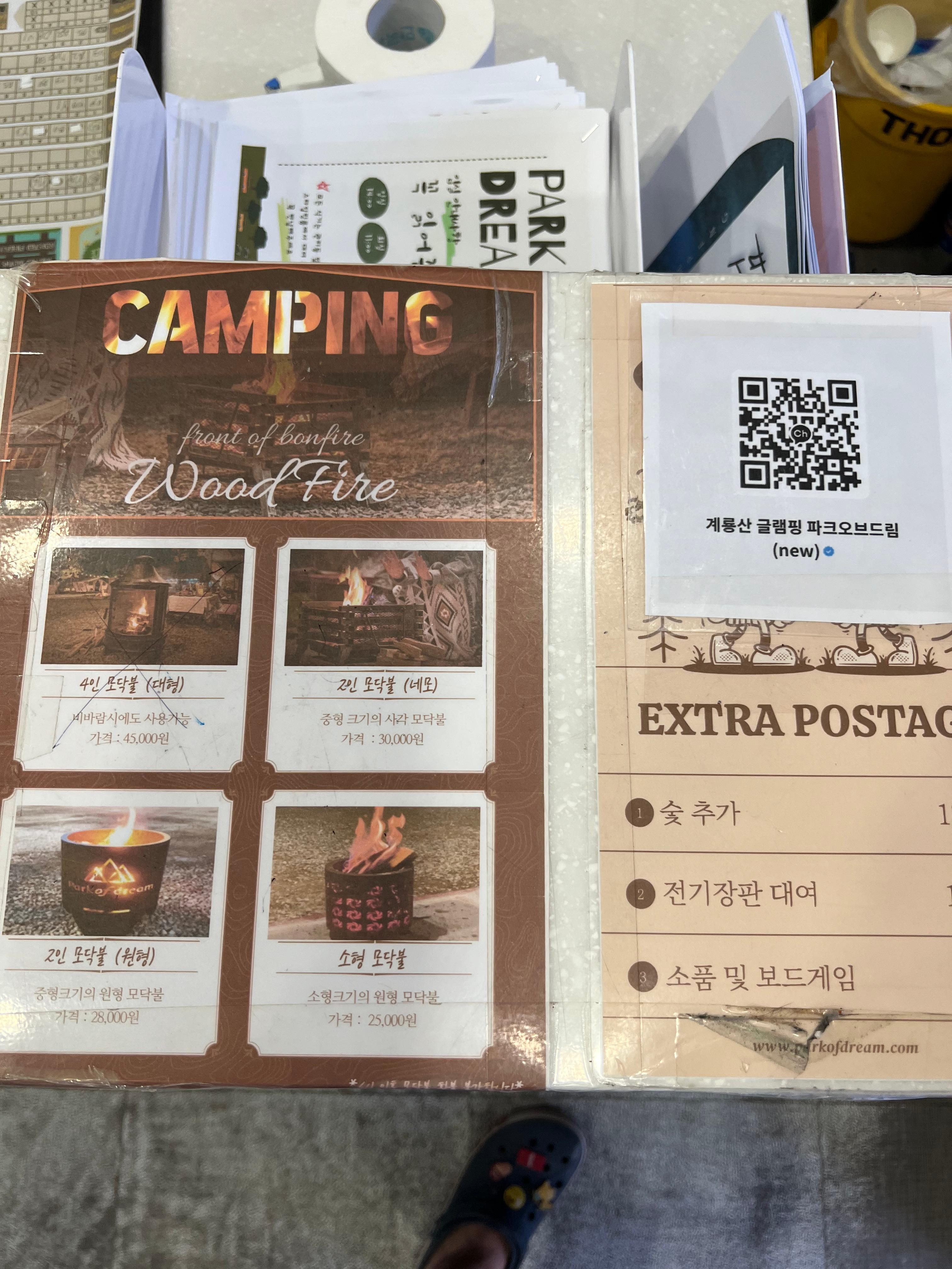 글램핑의 하이라이트는 바로 '불멍'이죠! 파크오브드림에서는 다양한 종류와 크기의 화로대와 장작을 패키지로 판매하고 있었어요. 취향에 맞게 고를 수 있어서 좋더라구요. 저희는 평소 같았으면 불멍을 했겠지만.. 나름 계획한 일정도 있고, 또 캠핑장 내에서 캠프파이어를 한다고 들어서 굳이 신청하진 않았어요. 저 불멍을 신청하면 마시멜로우 스모어를 만들어 먹을 수 있게 마시멜로우, 초콜릿, 크래커 를 주고 있었어요. (항상 주는지는 잘 모르겠지만.. 제가 갔을 때는 나눠줬었어요.)