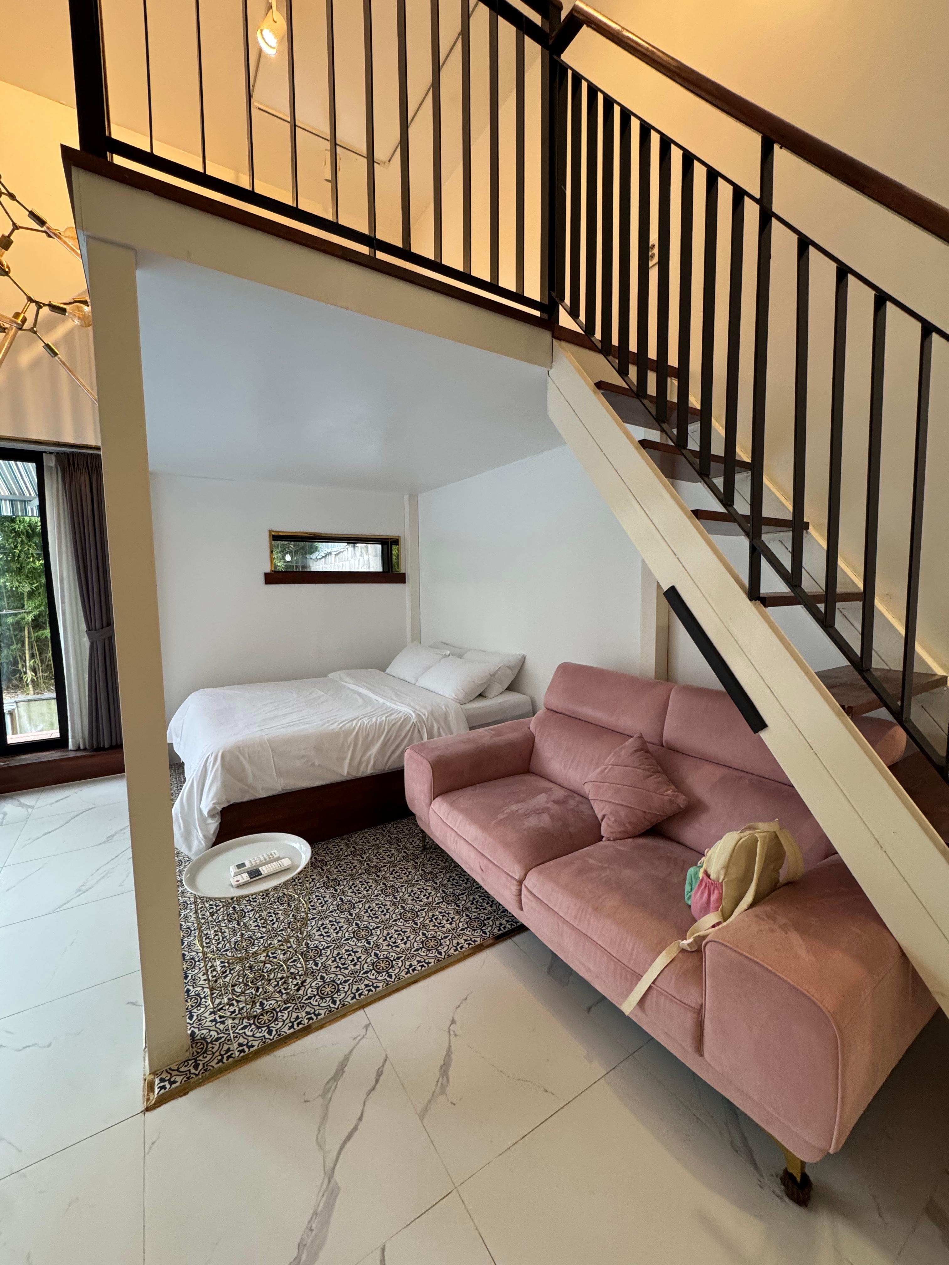 메인 장소인 거실에는 핑크색 소파와 넓은 침대가 있고, 바닥에는 패턴 러그 (돌이라 러그라 해도 될런지...) 가 놓여 있어서 아늑한 분위기를 더해줬어요. 짐을 정리하고 소파에 푹신한 앉아있으니 너무 일어나기 싫던....
