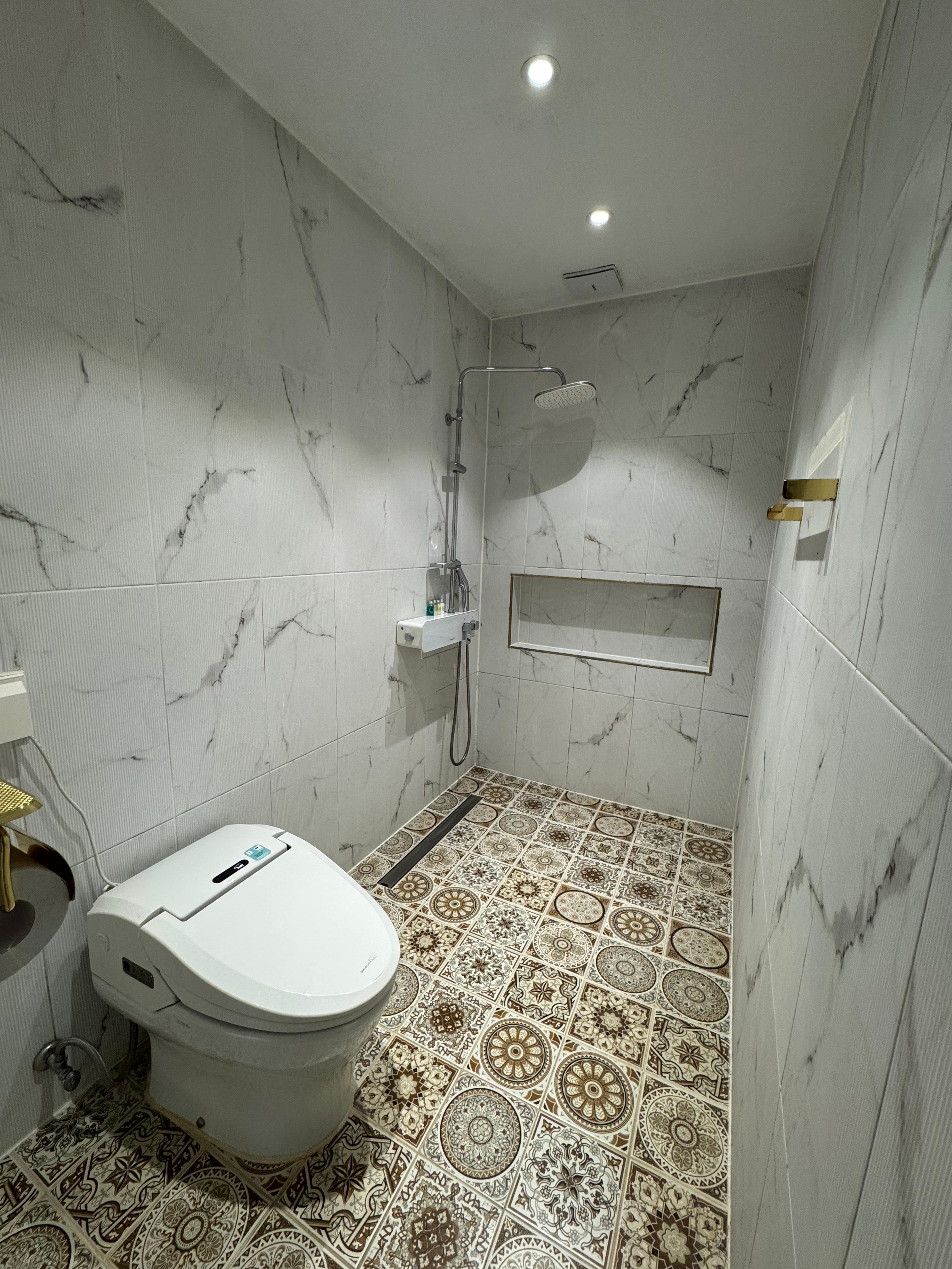 내부 화장실은 고급 비데가 설치된 좌변기에, 넉넉한 샤워 공간이 마련돼 있어서 아이들 둘을 데리고.. 3명이서 씻어도 답답하지 않았어요. 바닥 타일이 이국적이라 그런지 아이들이 보면서 신기해했네요.