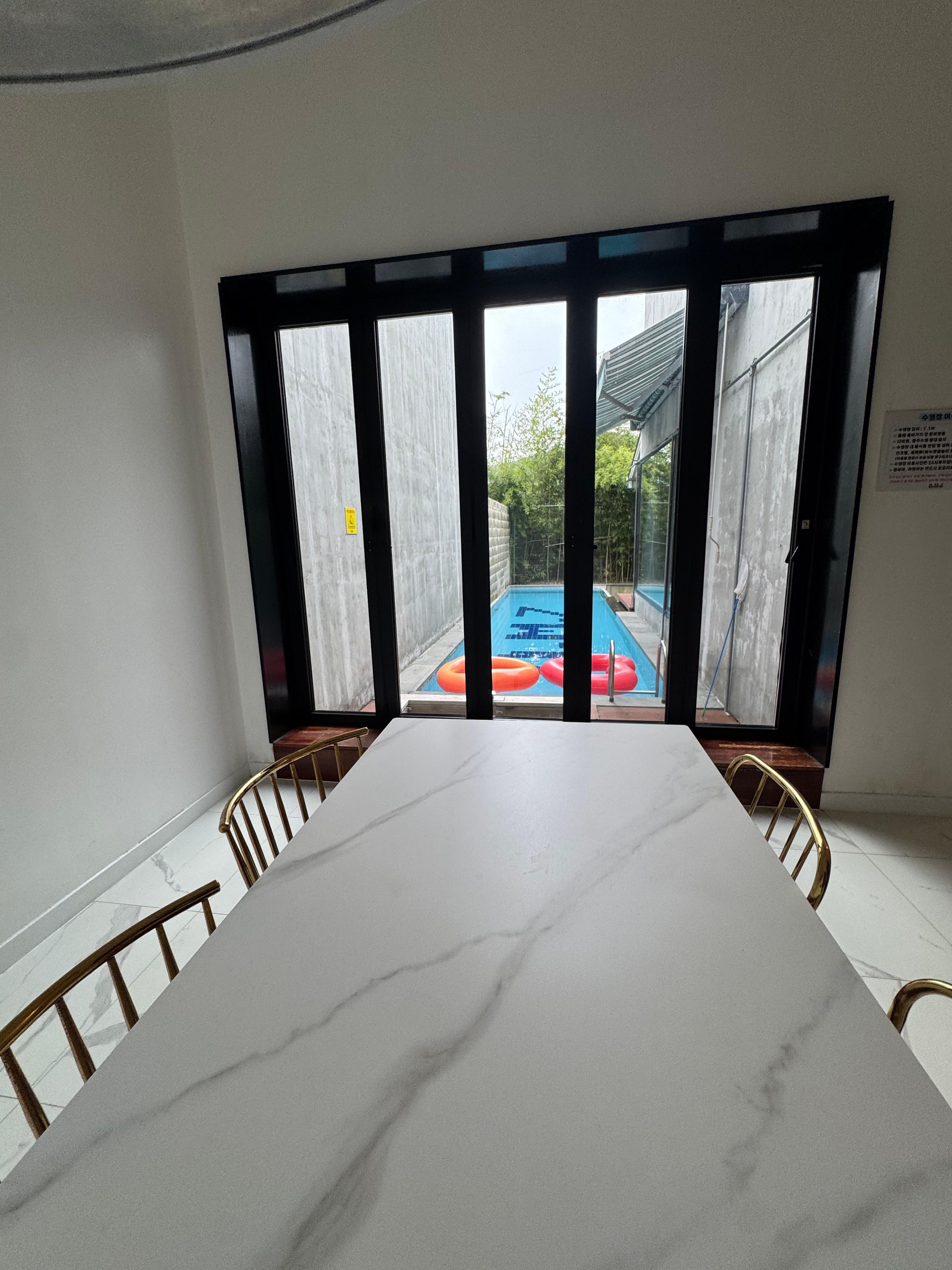 입구의 바로 왼쪽에는 냉장고와 널찍한 식탁이 있어요. 가족끼리 식사하기에 충분한 크기였고, 폴딩도어라서 전부 열면... 수영장도 바로 보여서 개방감이 엄청 좋았습니다.