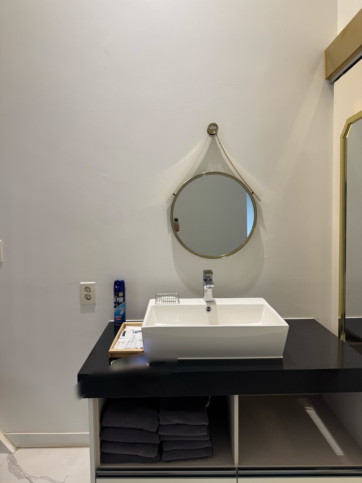 세면대 아래로 수건과 함께 서랍에는 드라이기와 여분의 화장지도 있습니다.